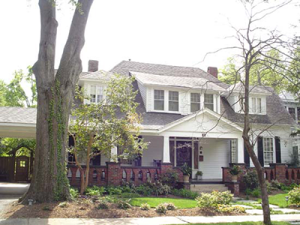 This 2 ½ story Rickman House has a one-story wrap-around porch and a gazebo with a tent roof. The structure features paired porch columns, a plain balustrade, paneled chimneys and projecting gambrels.