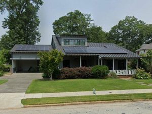 The home blends Craftsman elements with traditional design details common to mid-century and early 20th-century American houses, which includes symmetrical window placements, simple vertical siding, metal roof, and classic porch that speaks to practicality and comfort more than ornamentation.